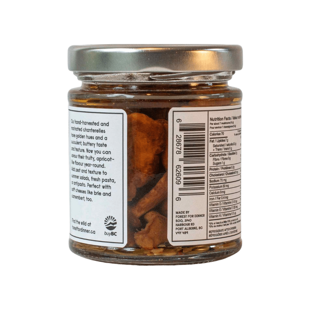 Our zingy pickled chanterelles let you enjoy this prized mushroom’s flavour year-round rather than just in season. We pickle them in a brim of organic apple cider vinegar, maple syrup, rosemary, garlic, fennel seeds and more. Then they are left marinated in oil for a well-balanced sweet and sour fruity flavour. The perfect way to add zest and texture to your plate.