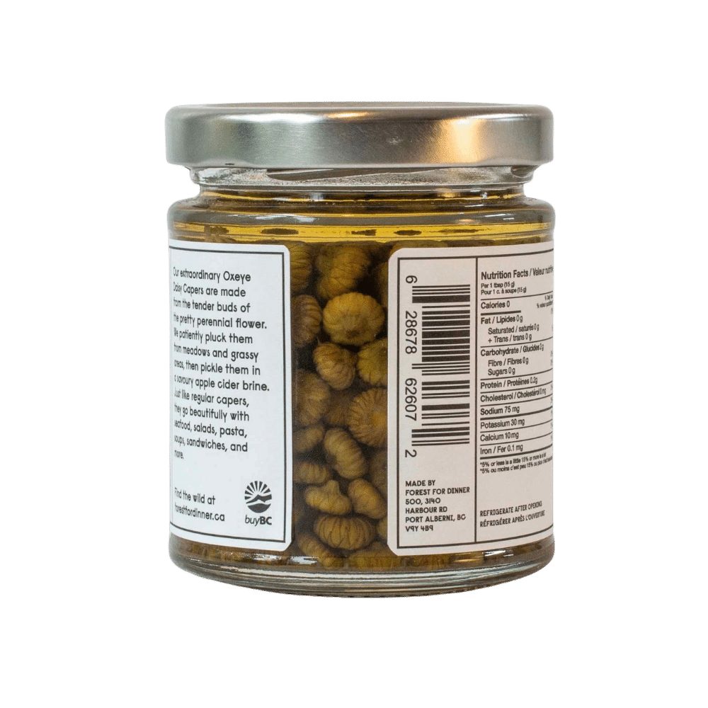 Our extraordinary Oxeye Daisy Capers are made from the tender buds of this pretty perennial flower. We patiently pluck them from meadows and grassy areas, then pickle them in a savoury apple cider brine. Just like regular capers, they go beautifully with seafood, salads, pasta, soups, sandwiches, or nibble them straight from the jar.