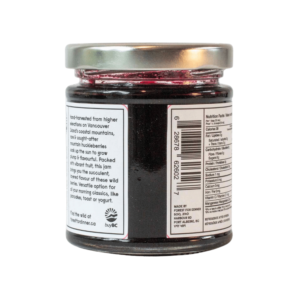 Hand-harvested from higher elevations on Vancouver Island’s coastal mountains, rare & sought-after mountain huckleberries soak up the sun to grow plump & flavourful. Packed with vibrant fruit, this jam brings you the succulent, layered flavour of these wild berries. Versatile option for all your morning classics, like pancakes, toast or yogurt.