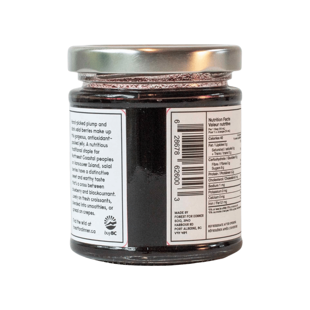 We handpick ripe, luscious, nearly black salal berries to make this gorgeous antioxidant-packed jelly that’s sweet and full of depth. Salal berries have a distinctively honeyed and earthy taste that some describe as a cross between blueberry and blackcurrant. You really have to try the Salal Berry Jelly yourself to savour its deeper, richer, and special flavours. It’s superb on fresh croissants, blended into smoothies, or spread on crepes.